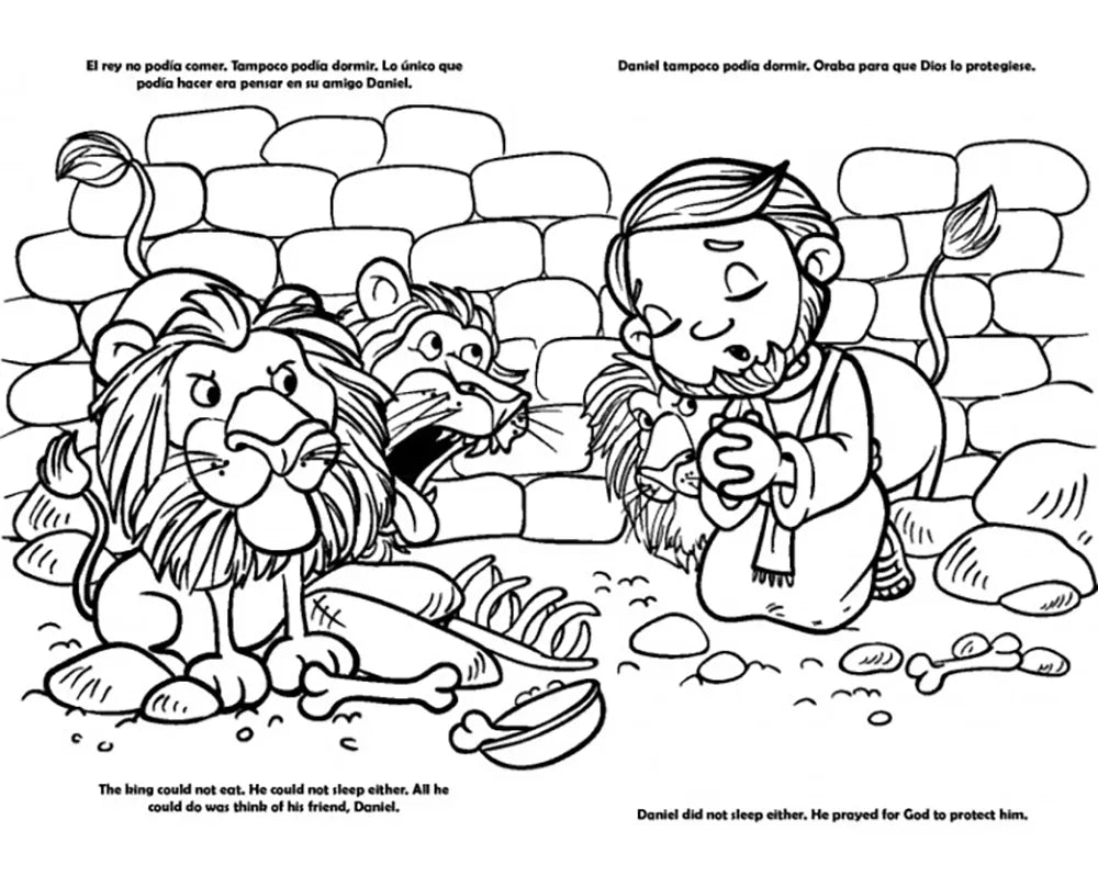 Un libro para colorear bilingüe para niños que cuenta la historia de Daniel. Con hermosos dibujos para que los niños se diviertan coloreando mientras aprenden sobre personajes de la Biblia.