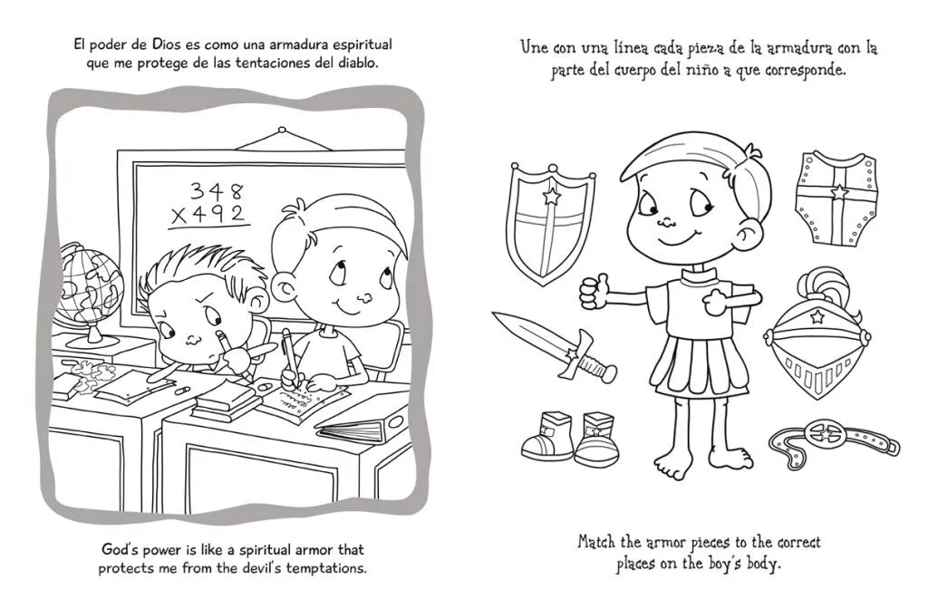 Coloring book, Ephesians 6, with a paraphrased verse and an illustration, making this well-known passage relatable to children, offering a meaningful time for coloring and activities.